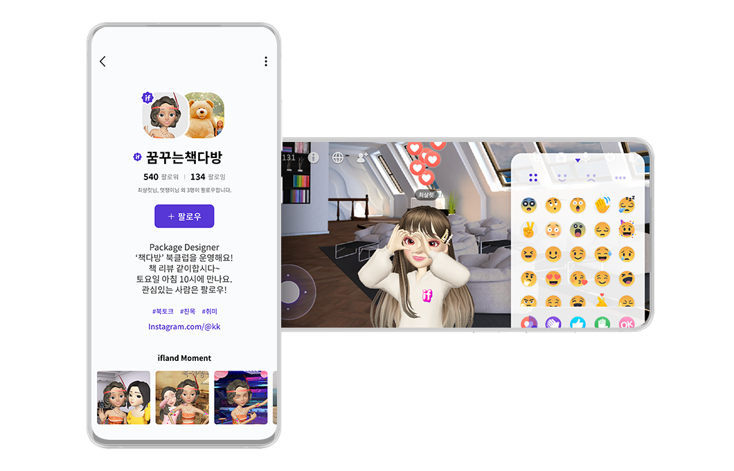 이프랜드는 SNS 같은 소셜 기능이 다양하다. 내 사진과 소개 글로 나를 표현하고, 내 관심사나 취미를 간략히 남길 수 있는 ‘프로필’ 기능이 있다. 메타버스 룸에서 친구들의 프로필을 쉽게 확인할 수 있고, 관심있는 아바타는 팔로우(follow)가 가능하다.
