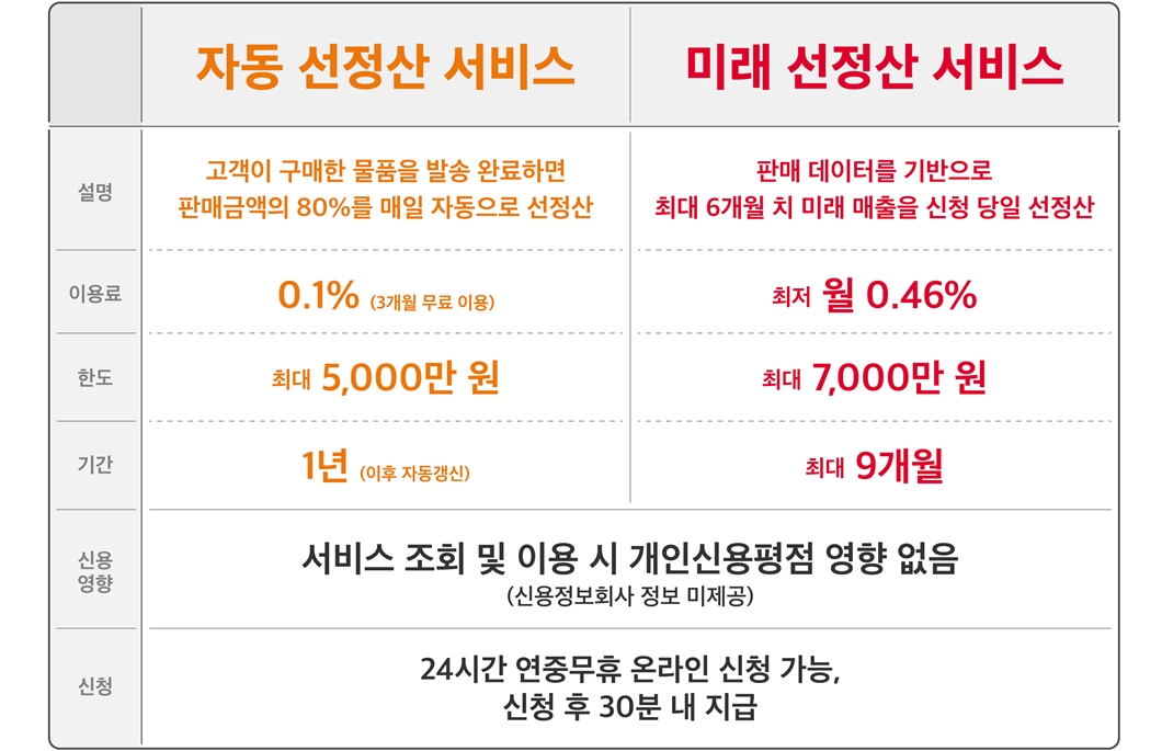 업계 최저 이용료 0.1% ‘자동 선정산’, 업계 최대 한도 7천만원 ‘미래 선정산’