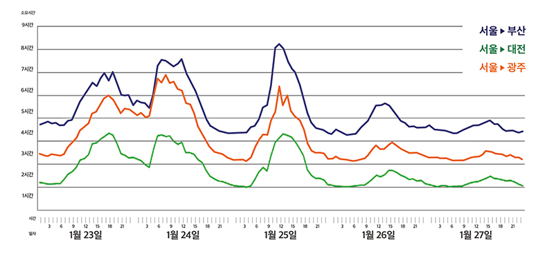 서울-부산은 상하행 양방향 모두 8시간 이상, 서울-대전 구간은 양방향 모두 4시간 이상, 서울-광주 구간도 양방향 모두 6시간 이상 소요될 것으로 예상된다. 이는 평상 시 소요시간 대비 약2-3시간이 더 걸리는 것이다.