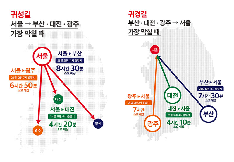 귀경길은 마지막 날인 27일(월)이 26일(일)보다 정체가 덜 할 것으로 보이며, ▲부산-서울의 경우 26일(일) 오전 11시 출발 시 7시간 30분 소요 ▲대전-서울 26일(일) 오후 4시 출발 시 4시간 10분 소요 ▲ 광주-서울 26일(일) 오후 2시 출발 시 7시간 소요로 귀경길 정체가 이어질 것으로 분석했다.