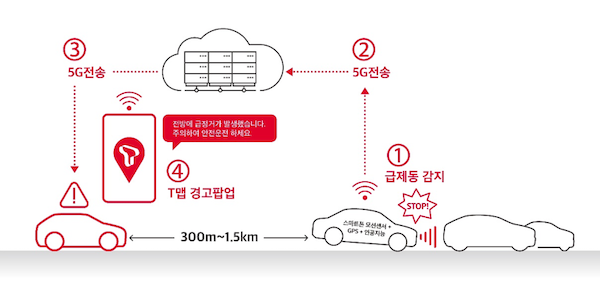 T맵 ‘급제동 안내’는 V2X기술을 통해 앞서가는 T맵 이용 차량이 급제동하면 사고 위험이 있다고 판단하고, 최대 1km내 뒤따르는 차량의 T맵 이용 화면에 일제히 경고 문구를 띄워 운전자의 안전운전을 돕는다.