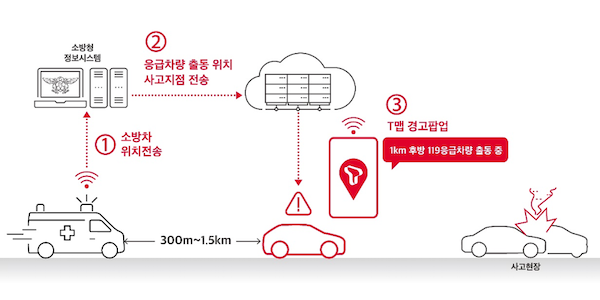 또한 SK텔레콤은 차량 정체로 사고가 잦은 고속도로 귀성∙귀경길에 빠른 사고차량 조치를 위해 ‘응급차량 안내’도 제공한다. ‘응급차량 안내’는 사고가 발생해 소방차나 구급차 등 응급차량이 출동할 경우, 출동 경로에서 운행하는 차량에 이를 알려주는 서비스다.