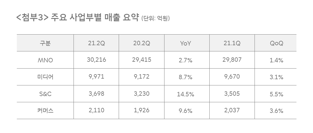 MNO사업은 5G 가입자 확대 등의 영향으로 전년 동기 대비 2.7% 증가한 3조 216억 원의 매출을 기록했다.
