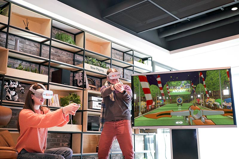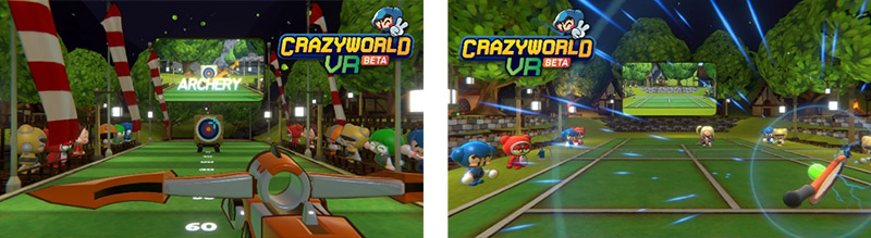 크레이지월드 VR 양궁게임(좌)과 테니스게임(우) 장면