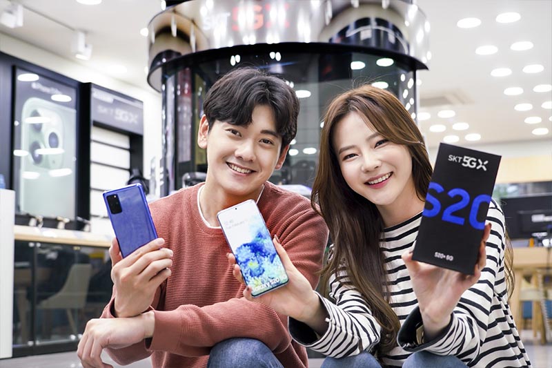 SK텔레콤 홍보모델들이 SK텔레콤 공식 인증 대리점에서 갤럭시S20 플러스 아우라 블루 모델을 소개하고 있다. SK텔레콤은 20일부터 갤럭시S20 예약 판매에 돌입하고 오는 27일부터 개통을 시작한다.