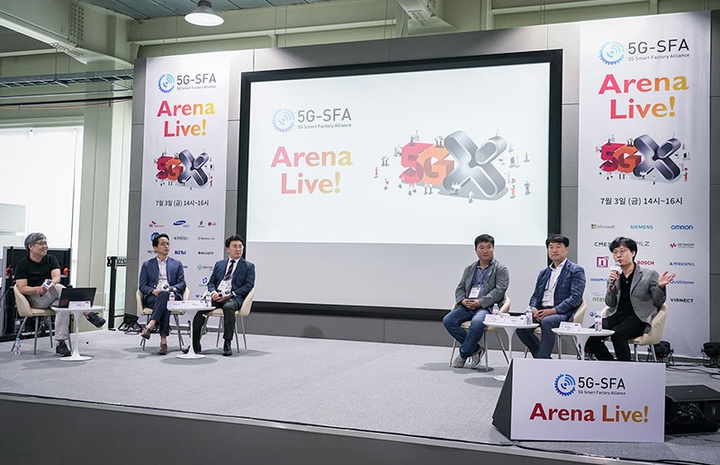 SK텔레콤 3일 경기도 안산시 ‘스마트제조혁신센터’에서 5G-SFA(Smart Factory Alliance) 주관 ‘5G SFA Arena Live’ 행사를 개최했다. SK텔레콤 최낙훈 Industrial Data 사업 유닛장과 SFA 관계자들이 스마트팩토리 확산 및 정착 비전에 대해 토론하고 있는 모습