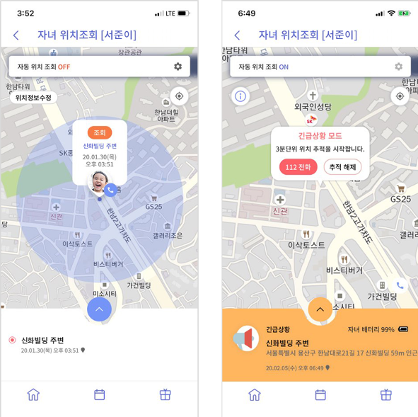 또한 자녀가 위급 상황에 처하면 ‘SOS긴급위치 알림’을 통해 부모에게 알림을 보낼 수 있다. 자녀가 전원 버튼을 5회 누르면 부모에게 자녀 위치와 함께 SOS 메시지가 전송되는 기능이다.
