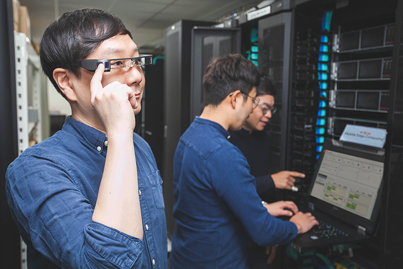 SK텔레콤 연구원이 MEC플랫폼이 설치된 서버실에서 AR글래스를 쓰고, 산업용 AR서비스를 시험해보고 있다.