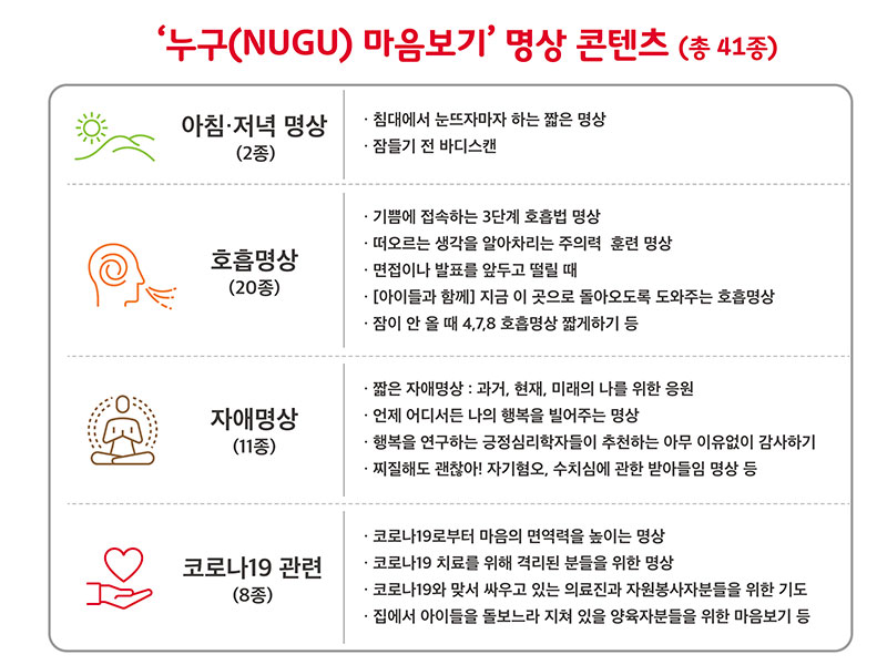 ‘누구 마음보기’는 총 41종의 명상 콘텐츠를 무료로 제공한다. 아침∙저녁 명상 2종, 호흡명상 20종, 자애명상 11종 등으로 구성돼 있다.