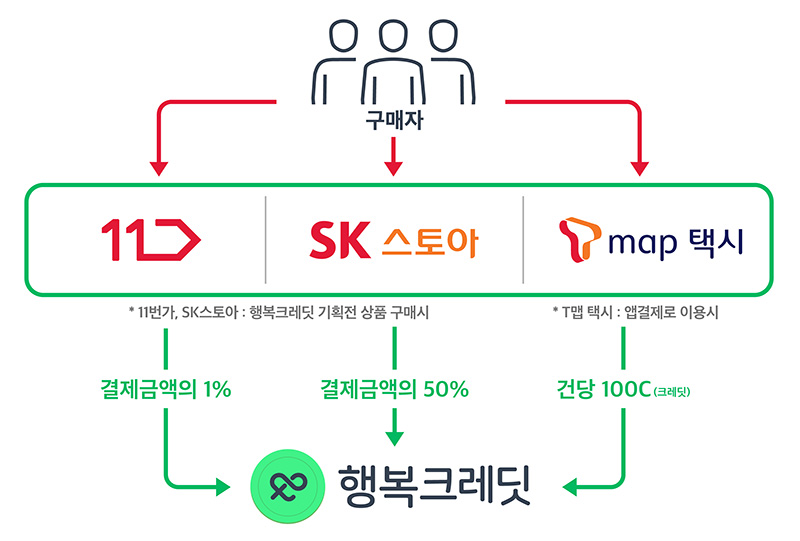‘행복크레딧’은 SK텔레콤에서 운영하는 신개념 기부 프로그램이다. 고객이 11번가나 SK스토아에서 사회적 기업이나 중소상공인 상품을 구매하면 SK텔레콤이 고객의 결제액에 따라 기부 전용 포인트를 적립, 누적된 포인트는 연말 사회공헌사업에 전액 기부된다.