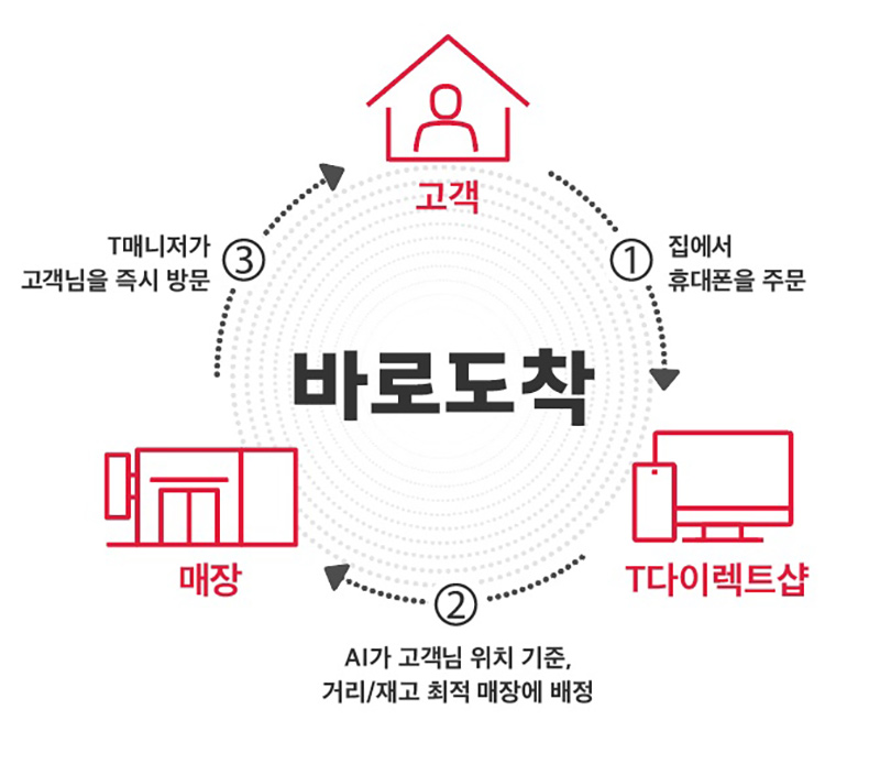‘바로도착’은 고객이 T다이렉트샵에서 휴대폰을 주문하면 AI가 고객과 가장 가까운 인근 SKT매장을 매칭, 해당 매장에 근무하는 T 매니저(매장직원)가 ‘주문 즉시’ 고객을 직접 찾아가는 컨시어지(Concierge) 서비스다.