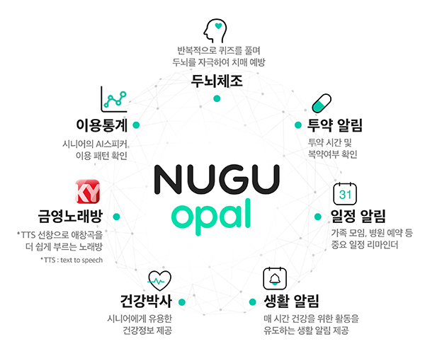 누구 오팔은 ▲투약알림 ▲일정알림 ▲생활알림 ▲두뇌체조 ▲건강박사 ▲이용통계 ▲금영노래방 등 시니어 고객의 생활에 필요한 서비스로 구성돼 있다.