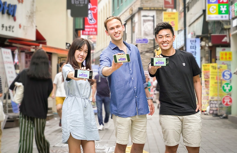 SK텔레콤에서 근무하고 있는 외국인 구성원들이 서울 명동에 위치한 T월드 매장 근처에서 외국인 맞춤 통신서비스 ‘미리(MIRI)’ 출시를 알리고 있다. ‘미리’는 월 정액 요금을 미리 납부할 수 있는 선불 서비스와 선택약정할인, 공시지원금, 멤버십할인 등 혜택을 누릴 수 있는 후불 서비스의 장점을 한데 모은 ‘선납(Upfront)’ 서비스다.