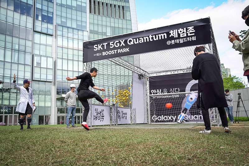 이영표 전 축구 국가대표 선수가 잠실 롯데월드타워 아레나광장 5GX 부스트파크에서 ‘갤럭시 A 퀌텀’ 출시를 기념해 ‘퀀텀 키퍼’가 지키고 있는 골문을 향해 힘차게 공을 차고 있다. SK텔레콤은 로봇 골키퍼가 내장된 센서를 통해 날아오는 공을 모두 막는데 착안해, 양자보안 기술로 개인정보를 보호하는 ‘갤럭시 A 퀀텀’ 만의 특장점을 어필하고자 이벤트를 기획했다.