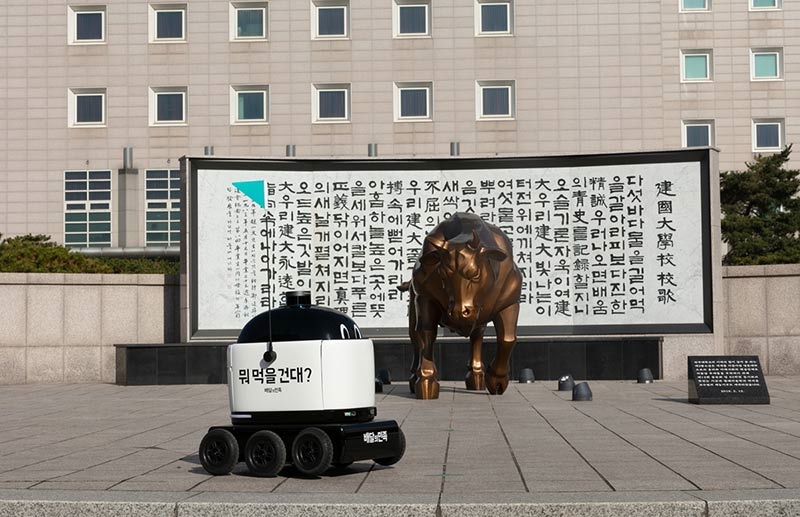 SK텔레콤과 우아한형제들은 5G 기반 초연결 서비스 확대 및 에지 클라우드 분야에서의 선도적 기술력 확보를 위해 5G MEC와 스마트 로봇을 활용한 사업 협력을 체결했다고 4일 밝혔다. 지난해 11월 건국대학교 서울캠퍼스에서 진행한 실외 자율주행 배달로봇 ‘딜리드라이브’ 테스트 전경
