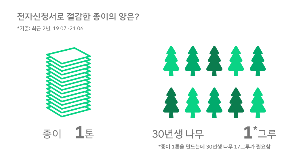 SKT는 전자신청서를 통해 최근 2년(19.07~21.06)간 총 66톤의 종이를 절감했습니다. 종이 1톤을 만드는데 30년생 나무 17그루가 필요한 것을 고려하면, 나무 1,122그루를 보호한 것과 같은 효과입니다.