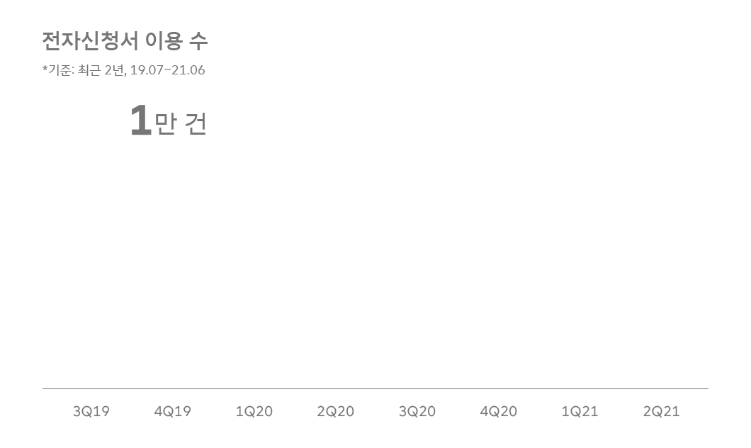 전자신청서 이용 수는 1,468만 건입니다. 2020년 2분기 이래 전자신청서는 분기 당 200만 건 이상 이용하고 있습니다. 2020년 3분기에는 295만 건으로 최다 이용 수를 기록했습니다.