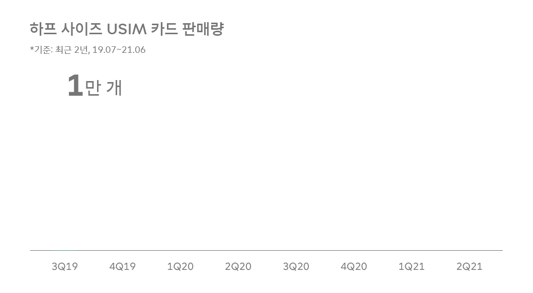 SKT가 2019년 7월부터 2021년 6월까지 2년간 판매한 하프 사이즈 유심은 686만 개입니다. 플레이트의 사이즈를 반으로 줄여서 절감한 플라스틱의 무게는 총 7.5톤*입니다. 이는 1.5리터 PET병 25만 개**를 줄인 것과 같은 효과입니다. 유심 카드 사이즈가 절반이 되면서 인쇄용지와 포장 비닐의 사용도 함께 줄일 수 있었습니다.