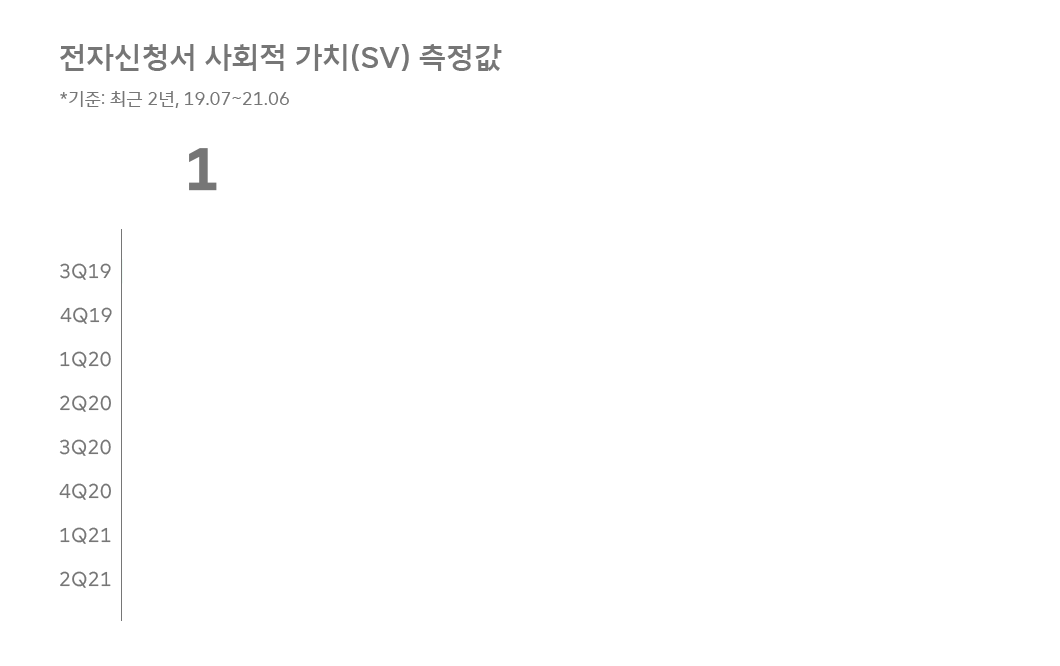 전자신청서가 창출한 사회적 가치는 2,773만 원입니다. 2020년 한 해에만 1,715만 원의 사회적 가치를 실현했습니다. 2020년 3분기에는 분기 당 가장 많은 사회적 가치인 580만 원을 기록했습니다.