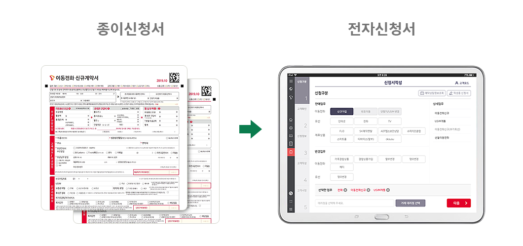 SKT는 2012년 7월 ‘전자신청서’ 시스템을 본격 도입했습니다. 종이 가입신청서 대신 태블릿PC를 활용하는 전자시스템을 채택해 자원 절약은 물론 개인정보 유출에 대한 우려도 불식하겠다는 목표를 세우고 전국 2,200개 공식 인증 대리점부터 시작했습니다. 그 후 7년 뒤인 2019년 7월, 정부와 협의해 전자신청서 시스템을 타사 및 판매점까지 사용할 수 있게 확대했습니다. 이를 통해 이동통신 대리점과 판매점에서 종이로 만든 가입 신청서는 크게 감소 추세에 있습니다.