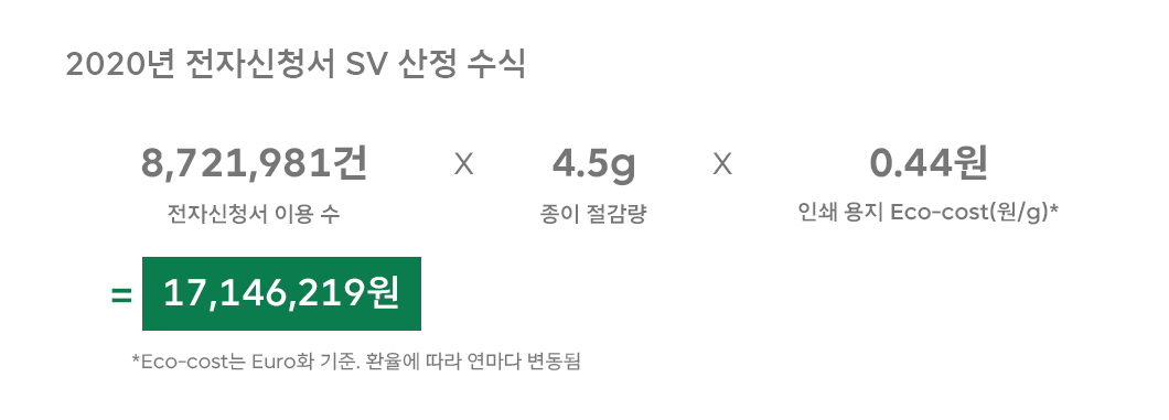 전자신청서의 사회적 가치 산정 수식은 전자신청서 이용 수에 종이신청서 한 장의 중량과 Eco-cost*를 곱한 값입니다. 2020년 기준으로 작성한 산식에서 더 자세하게 확인할 수 있습니다.