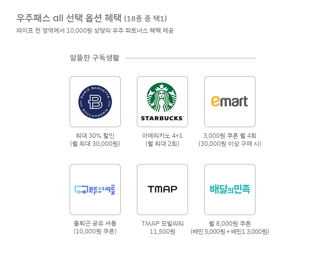 우주패스 all 옵션 혜택으로 이마트를 선택하면 매주 사용 가능한 3,000원 할인 쿠폰을 월 4회 제공한다. 스타벅스를 선택하면 아메리카노 4잔 구매 시 1잔은 무료혜택을 월 2회 이용할 수 있다.
