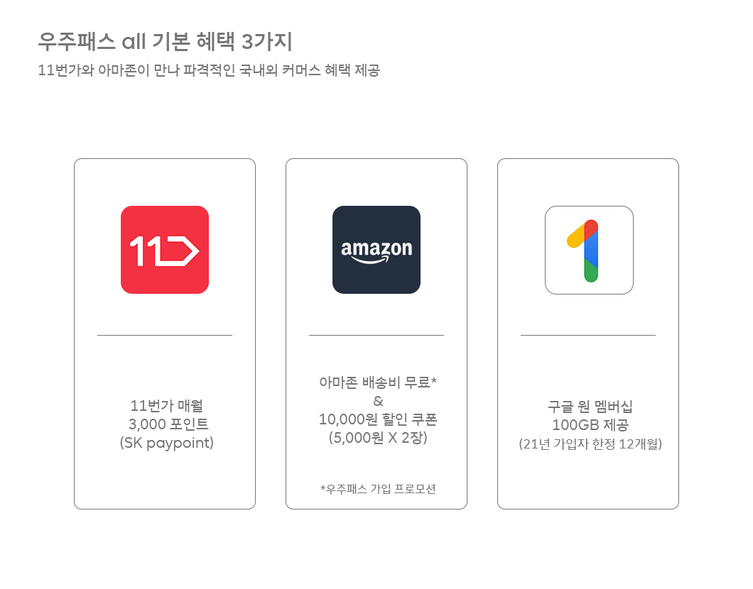 월 9,900원(VAT 포함)의 우주패스 all은 11번가 3,000 포인트, 아마존 무료 배송* 및 1만 원 할인 쿠폰, 구글 원 멤버십 100GB 12개월 무료혜택**을 기본 제공한다. 추가로 고객이 18종의 개별 구독 상품 (월 8,000원~1만 원 상당) 중 1가지를 선택 수 있다.