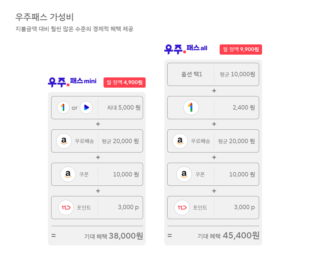 우주패스 상품은 지불 금액 대비 훨씬 많은 경제적 혜택을 제공한다. 우주패스 mini는 월 4,900원의 월정액에 3만 8,000원의 기대 혜택을 누릴 수 있다. 우주패스 all은 월정액 9,900원에 4만 5,400원 상당의 혜택을 제공한다.