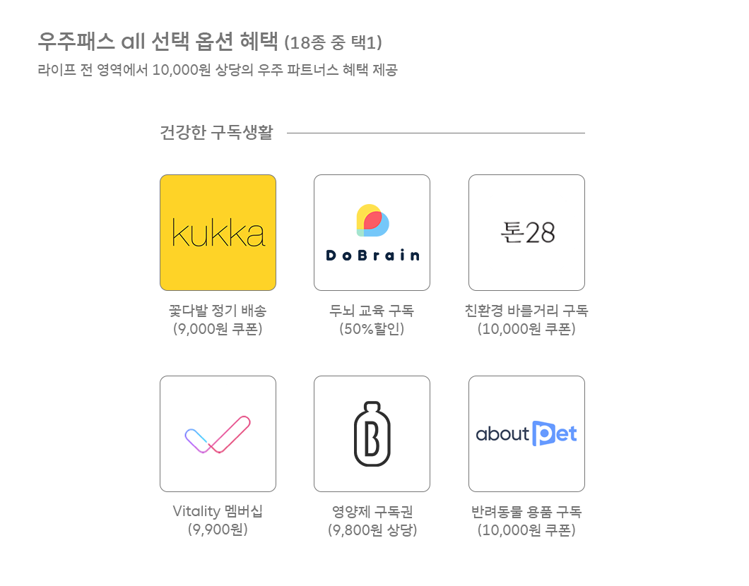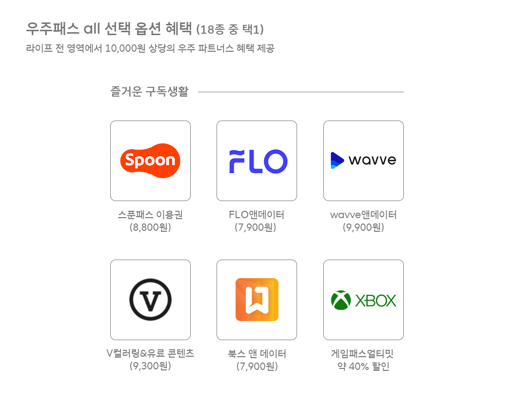 우주패스 all의 개별 구독 상품은 다양한 카테고리에서 취향에 맞게 선택할 수 있다. 옵션은 총 18종이며, 이 중 한 가지를 택할 수 있다.