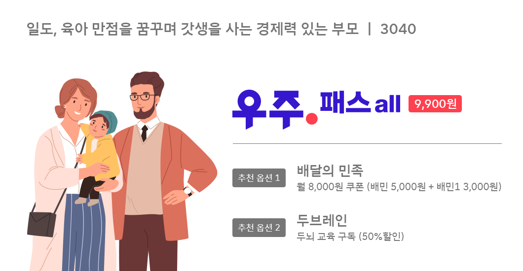 우주패스 all 혜택 중 18종의 옵션은 ‘배달의 민족’을 추천한다. 배달의 민족을 선택하면 매월 배민 5,000원, 배민1 3,000원 등 총 8,000원의 쿠폰 혜택을 받을 수 있다. 만약 아이 교육 콘텐츠를 이용하고 싶다면 두브레인 옵션을 선택해도 좋다. 7세 이하 아동 두뇌교육 용 교육 콘텐츠를 50% 할인가에 이용할 수 있다.