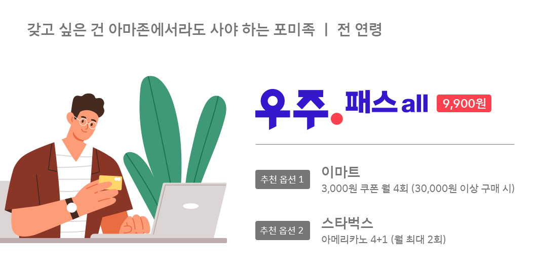 최씨는 나를 위한 소비에 그 누구보다 열정적인 일명 ‘포미족*’이다. 최씨처럼 직구와 쇼핑에 열광한다면 우주패스 all + 이마트 옵션을 추천한다.