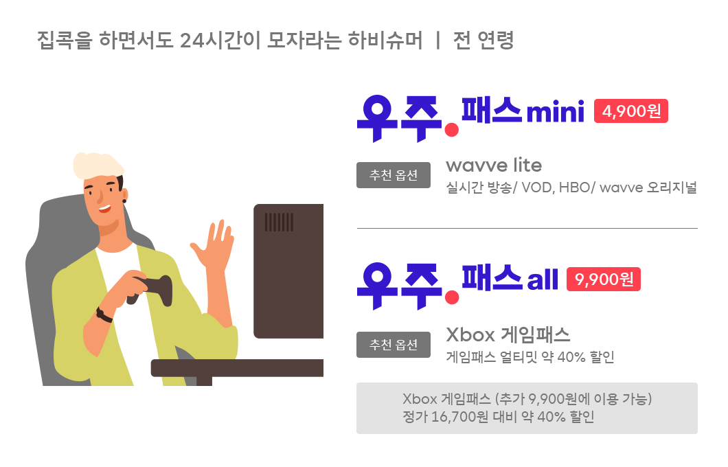 취미활동에 소비를 아끼지 않는 하비슈머*는 꾸준히 늘어나는 추세다. 특히 코로나19로 인해 대면 접촉이 제한되면서 혼자 할 수 있는 취미활동에 대한 수요가 증가했다. 취미 부자인 대학생 박씨를 위한 추천 구독 패키지는 우주패스 all + 게임패스 얼티밋 조합이다. Xbox의 화려한 대작 게임을 즐길 수 있는 게임패스 얼티밋(월 1만 6,700원)을 약 40% 할인된 가격에 이용할 수 있다.