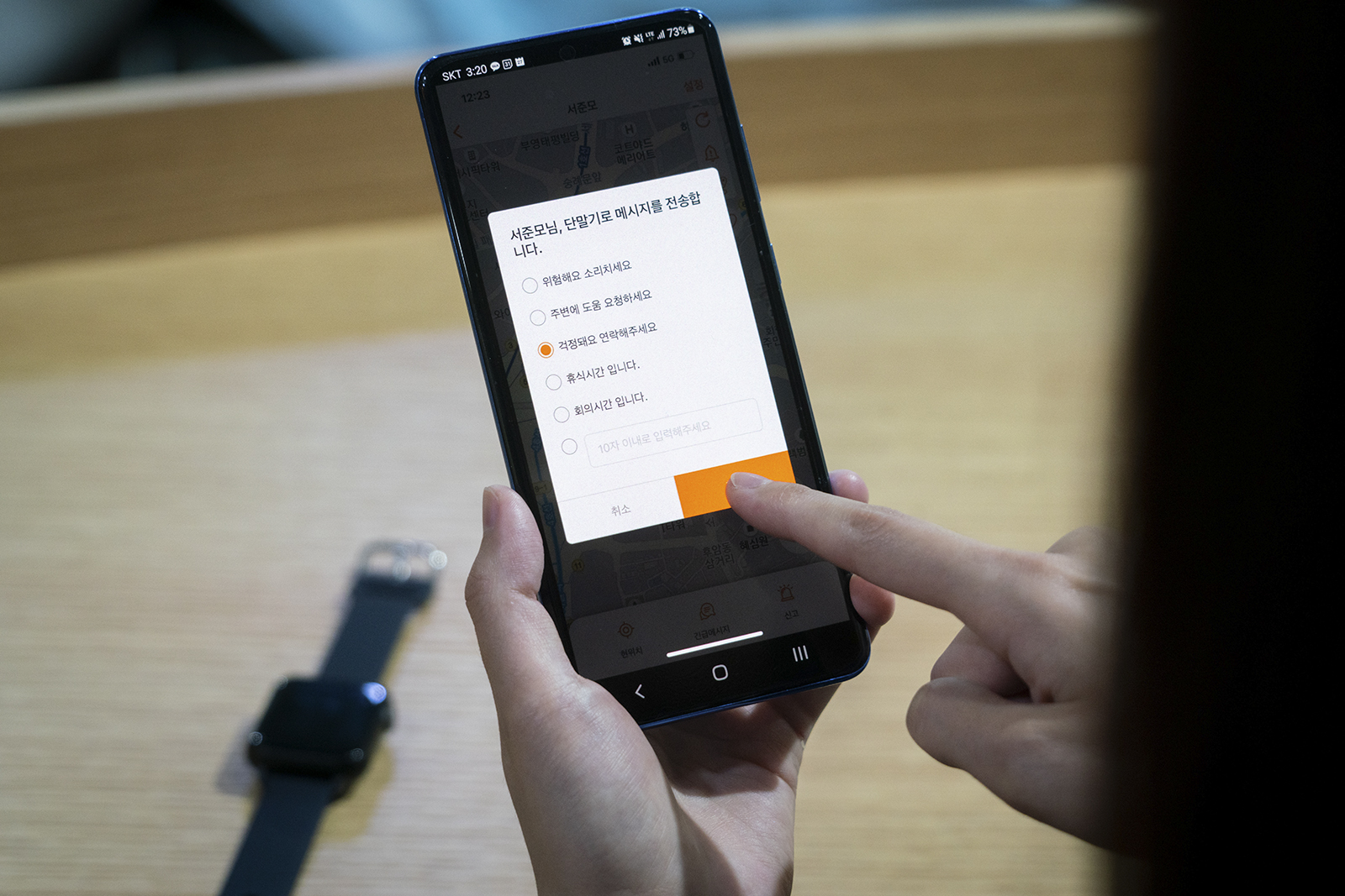 보호자는 착용자의 상황이 좋지 않다고 판단할 경우 “걱정됩니다. 전화주세요” 등의 간단한 긴급 메시지를 착용자에게 보낼 수 있으며, 착용자는 기기의 SOS 응급호출 버튼을 눌러 쉽고 빠르게 보호자에게 도움을 요청할 수 있다.