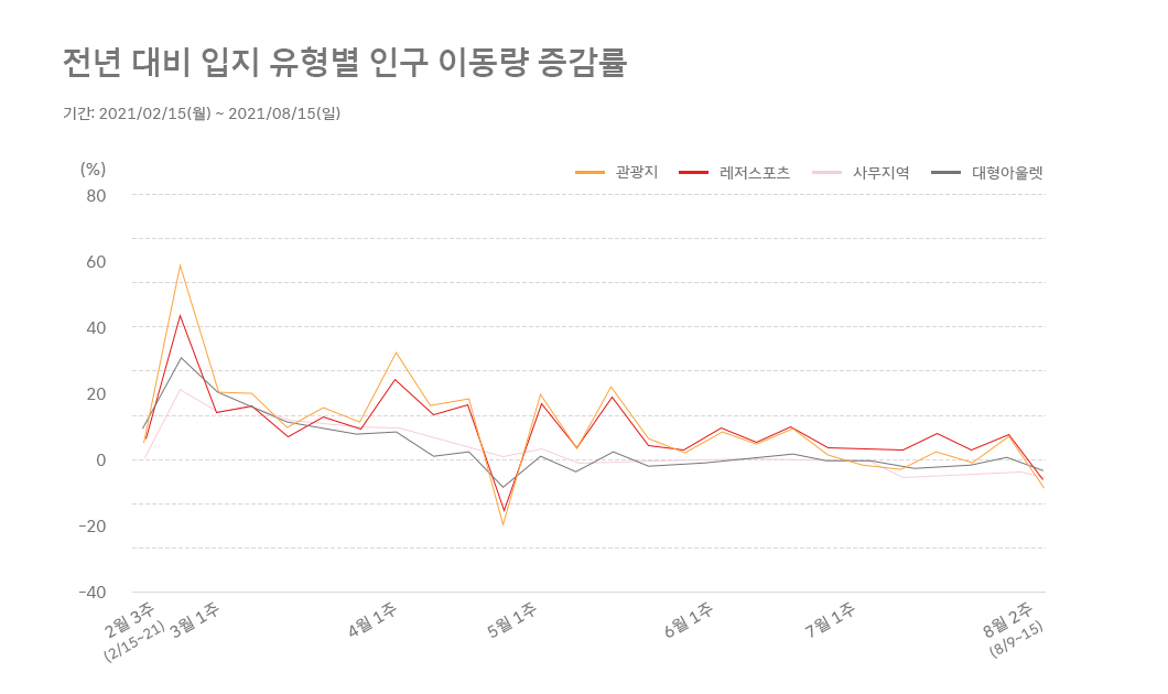 구체적으로 2월 15일부터 8월 15일까지 연령별 • 입지 유형별 • 시도별 이동 데이터를 살펴보면, 연령별로는 지난해 같은 기간에 비해 20세 미만의 이동량 증감폭이 가장 크게 나타났다. 입지 유형별로는 관광지, 레저스포츠를 즐길 수 있는 지역으로 인구 이동량은 증가했다. 반면, 사무지역*, 대형 아울렛은 지난해 같은 기간과 비교해 증가폭이 작았으며, 코로나 4차 유행(7/5~8/22) 기간에는 지난해 대비 이동량이 소폭 감소했다.