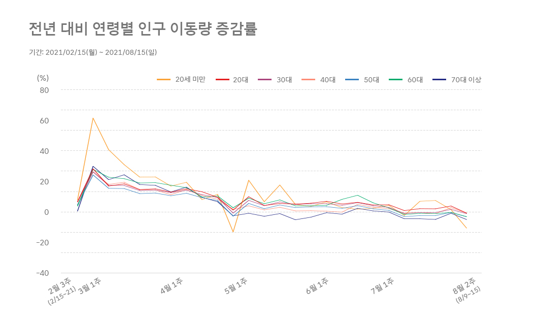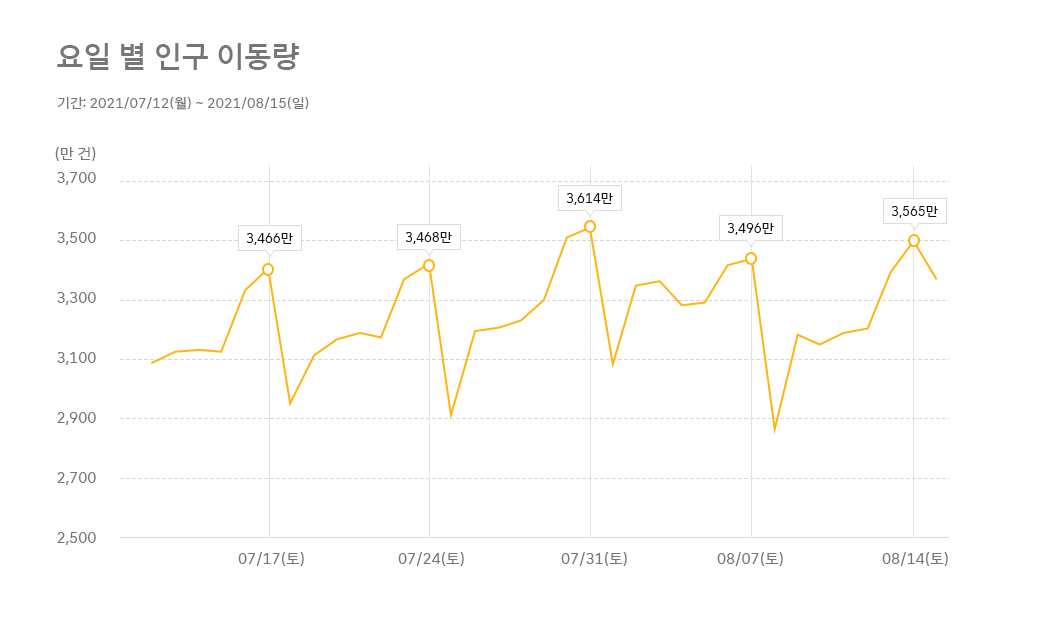 반면 코로나 4차 유행이 본격적으로 시작된 지난 7월 둘째 주(7/5~7/11)부터 8월 22일까지 일 평균 인구 이동량은 3,266만 건으로 나타났다. 올해 3~6월 하루 평균 인구 이동량(3,355만)과 비교해 소폭(2.7%) 감소한 수준이다. 8월에도 비슷한 수준인 일 3,100만~3,300만 대를 유지하고 있다.