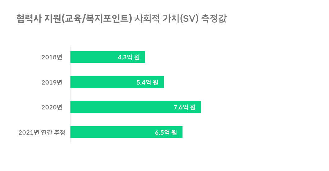 SKT는 협력사 임직원을 대상으로 교육 및 복지포인트를 지원하고 있습니다. 이를 통해 ’18년 4.3억 원, ’19년 5.4억 원, ’20년 7.6억 원의 사회적 가치를 창출했습니다. ’21년에는 6.5억 원의 사회적 가치를 창출할 것으로 기대하고 있습니다. 이는 ’18년과 비교해 51% 증가한 수치입니다.