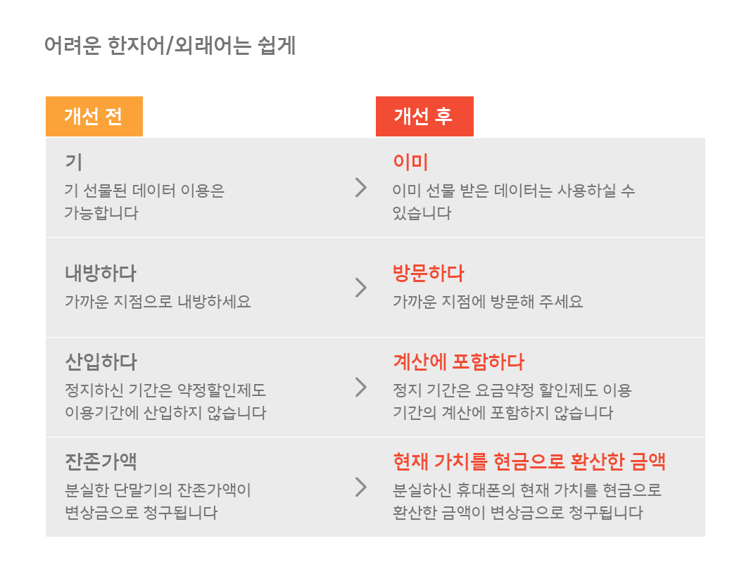 두세 번 읽어도 쉽게 이해하기 어렵다. 관련업 종사자가 아닌 일반 고객에게는 ‘외계어’나 다름없다. SK텔레콤은 지난 2019년부터 이런 용어들을 쉽게 바꾸기 시작했다. 이동 통신 서비스는 어린이부터 노인까지 모두 활용하는 서비스인만큼, 고객이 알기 쉬운 용어로 소통하겠다는 취지다.
