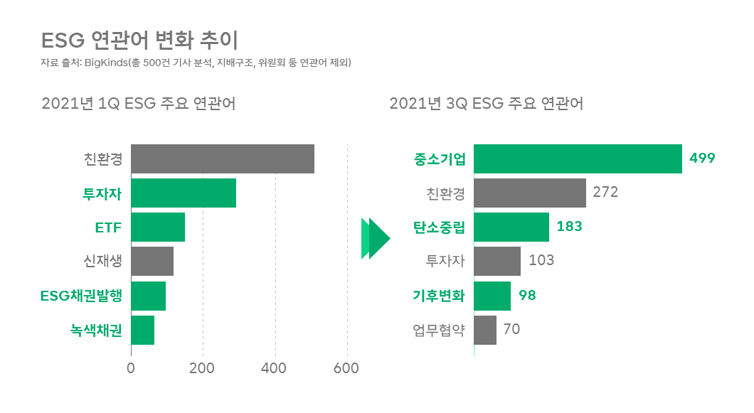 다만 ESG에 대한 관심 내용은 조금씩 변했습니다. 2021년 1사분기에 ‘투자자’, ‘ESG채권’, ‘녹색채권’ 등 투자 관련한 내용이 상대적으로 많았다면, 3사분기에는 ‘중소기업’, ‘탄소중립’, ‘기후변화’ 등의 연관어가 새롭게 부상했습니다.