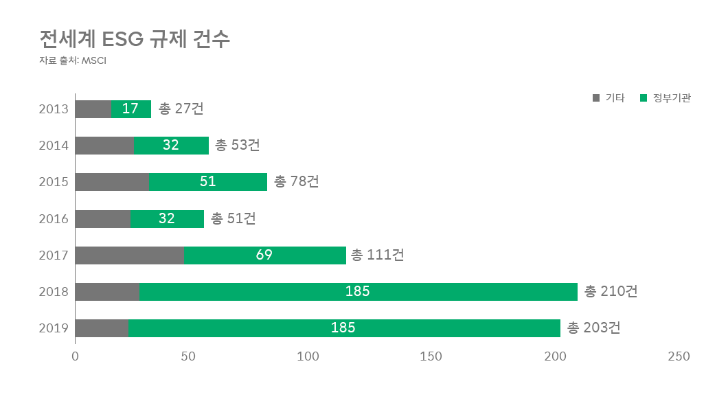 둘째는 규제 기관입니다. 2015년 파리협약 전후로 ESG 규제가 빠르게 증가하고 있습니다. ESG 평가기관 MSCI 자료에 의하면, ESG 규제 건수는 2017년부터 폭증하고 있습니다. 특히 정부 기관의 규제가 압도적으로 많아지고 있습니다.