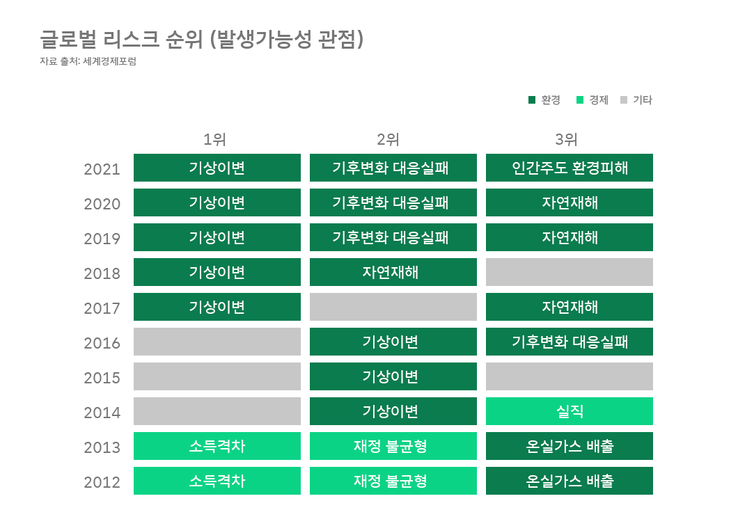 세 번째는 무엇보다도 기후 위기의 심각성입니다. 세계경제포럼에서 발표한 글로벌 리스크 순위를 보면 2010년 초반만 하더라도 경제 관련 내용이 1위였으나, 2017년부터는 줄곧 환경 관련 내용이 1위 및 상위권을 차지하고 있습니다.