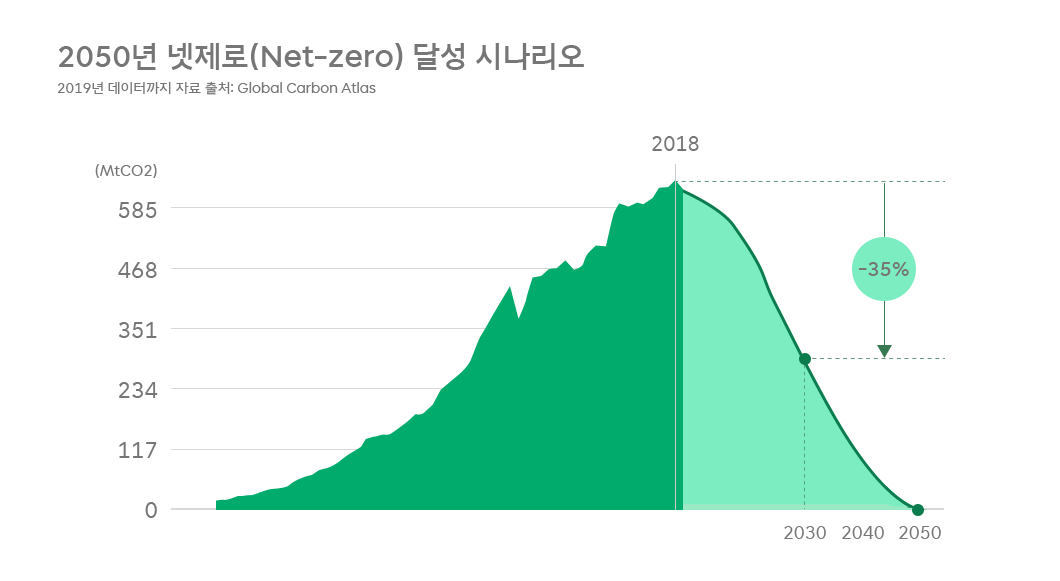 2018년 기준 우리나라의 이산화탄소 배출량은 세계 11위로 매우 높습니다. 우리나라 역시 탄소중립을 선언한 데 이어, 지난 9월 국무회의에서 ‘탄소중립녹색성장기본법’을 의결했습니다. 이에 따르면 우리나라는 2030년까지 이산화탄소를 2018년 대비 35% 이상 감축해야 합니다.