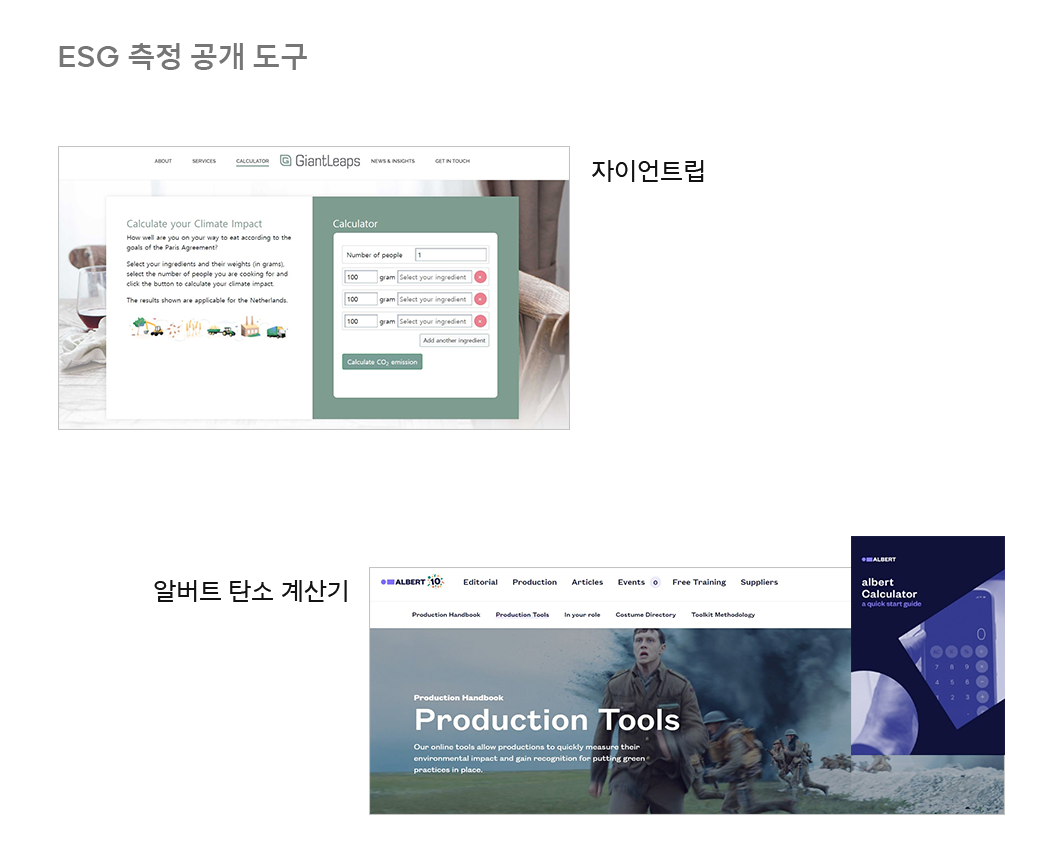 네덜란드 요구르트 체인점인 ‘요구르트 반’은 가치사슬 전반에 걸쳐 이산화탄소를 측정하고 이를 기반으로 개선 과제를 도출하는데 자이언트립(Giant Leaps)이라는 공개 도구를 활용했습니다. 친환경 신발 ‘올버즈’는 2020년 4월부터 제품별로 생산·폐기 전 과정에서 발생하는 탄소량을 표시한 데 이어, 지난 4월에는 자신이 구축한 방법론을 다른 기업도 사용할 수 있도록 공개했습니다. 디지털 콘텐츠 제작기업 ‘캠프’는 영상 제작 프로젝트별로 알버트 탄소 계산기를 통해 환경 영향을 측정하고 개선했습니다. 광고 및 온라인 콘텐츠를 위한 도구로는 애드그린(Adgreen)이 있습니다. 이러한 다양한 무료 공개 도구를 활용하면 어렵지 않게 ESG 현황 측정이 가능합니다.