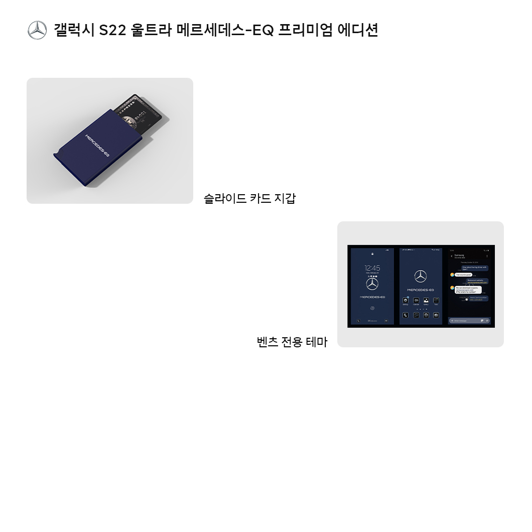 슬라이드 카드 지갑은 알루미늄 소재, 슬림한 디자인으로 제작되었고, 카드를 최대 7장까지 보관할 수 있다. SKT는 메르세데스-EQ 프리미엄 에디션 구매 고객을 위한 전용 테마도 제공한다. 구매 고객은 패키지에 동봉된 다운로드 QR 코드를 촬영, 갤럭시 S22 울트라를 벤츠 테마로 장식할 수 있다.