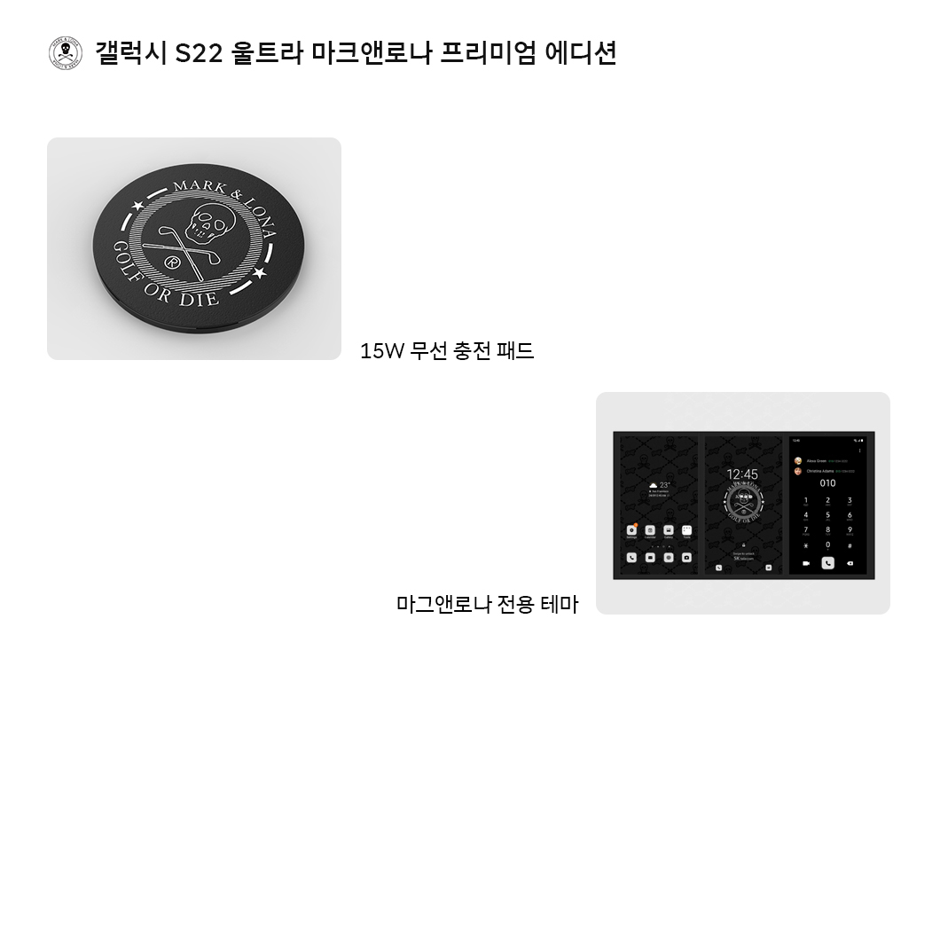 무선 충전 패드 겉면에는 최고급 소가죽이 덧붙었고, 15W 출력으로 갤럭시 S22 울트라를 충전해 준다. 마크앤로나 프리미엄 에디션 구매 고객 또한 전용 테마를 사용할 수 있다. 패키지에 동봉된 다운로드 QR 코드를 촬영하면 트렌디한 테마로 갤럭시 S22 울트라를 꾸밀 수 있다.