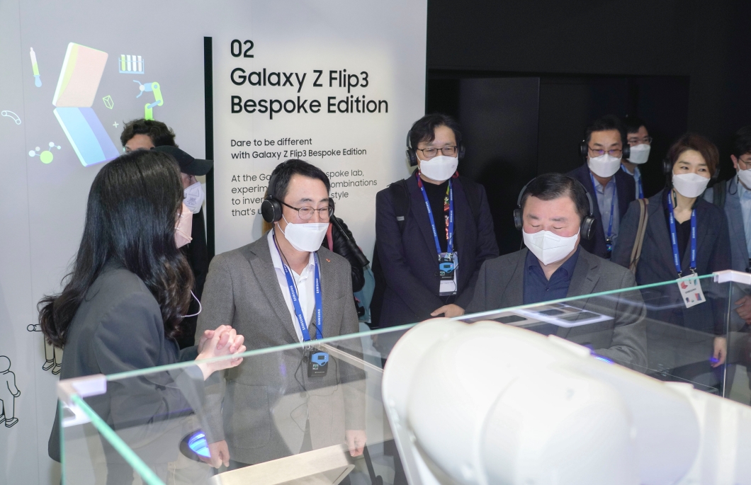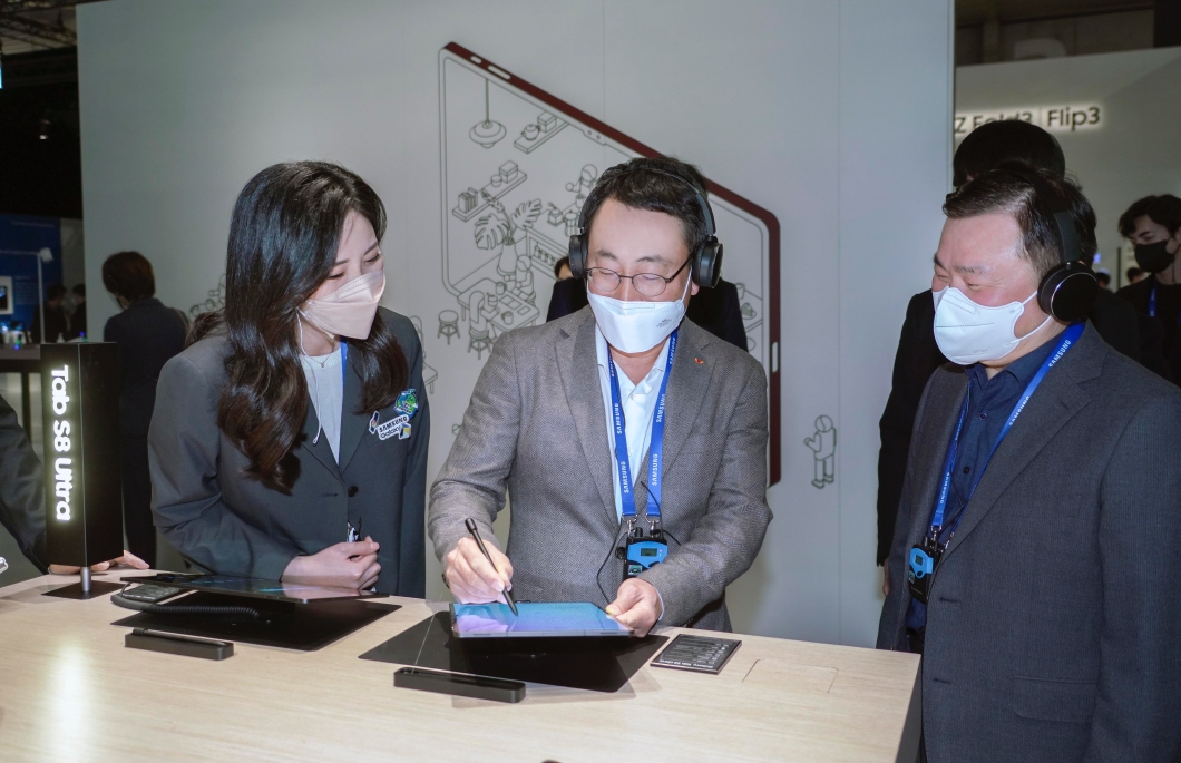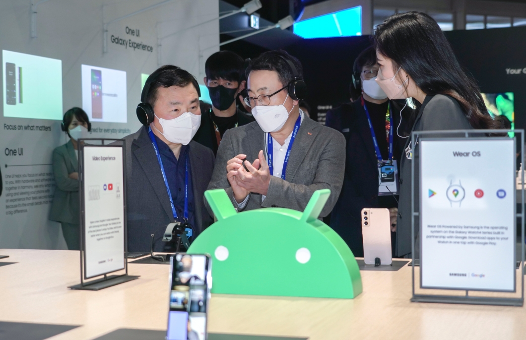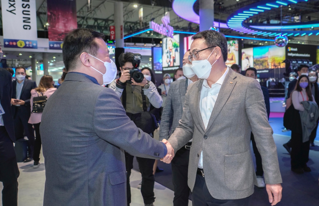 28일(현지시간) 스페인 바르셀로나에서 개막한 MWC22에서 SKT 유영상 사장이 삼성전자 노태문 사장과 삼성전자 부스를 둘러보고 있다.