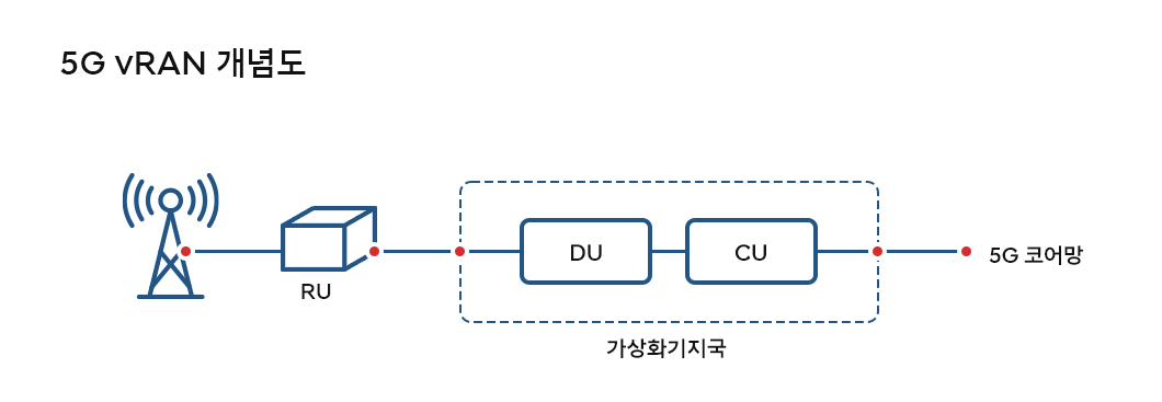 가상화기지국(이하 vRAN, virtualized Radio Access Network)은 기지국 접속망 장비(RAN)*의 다양한 네트워크 기능을 소프트웨어 형태로 탑재하는 기술이다. 마치 컴퓨터에 소프트웨어를 설치하듯 일반적인 서버에 다양한 네트워크 기능들을 설치해 기지국 관리에 드는 물리적 시간과 비용을 절감할 수 있는 점이 특징이다. 이를 통해 이통사와 장비사들은 4G 네트워크 보다 많은 기지국 장비를 구축해야 하는 5G 기지국 관리 작업도 규모감 있고 신속하게 처리할 수 있다.