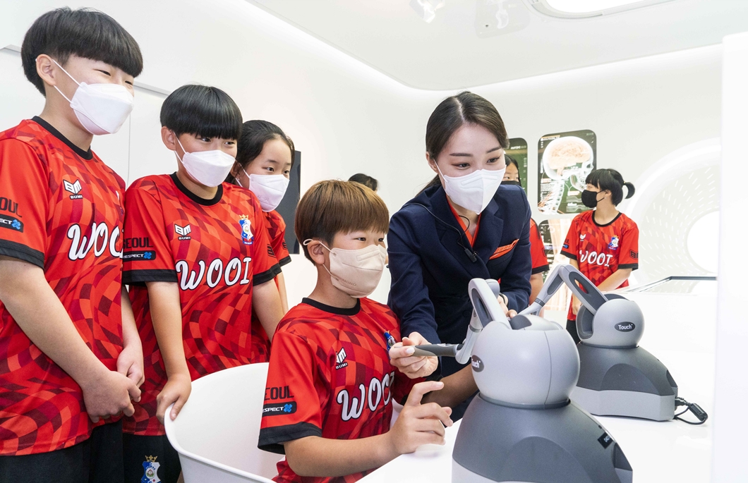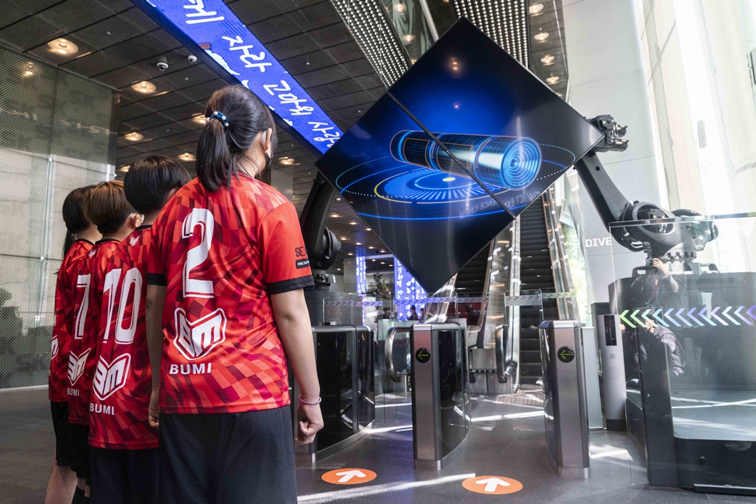 SK텔레콤은 본격적인 일상회복을 맞아 대한민국 대표 ICT체험관 '티움(T.um)'의 오프라인 투어 프로그램을 재개한다. 사진은 4일 오전 서울특별시 유일의 초등 여자 축구팀인 우이초등학교 축구부 선수들이 ‘티움’을 방문해 첨단 기술로 구현될 미래 세상의 모습을 체험하는 장면