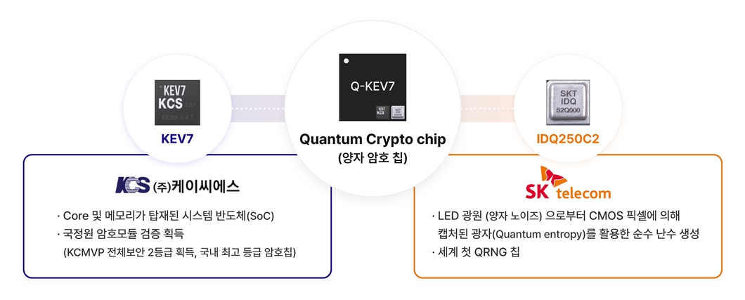 SKT는 케이씨에스와 함께 양자난수생성기(QRNG)와 암호통신기능의 반도체를 하나로 합친 ‘양자암호 원칩’(Quantum Crypto chip)을 개발하고 있다.