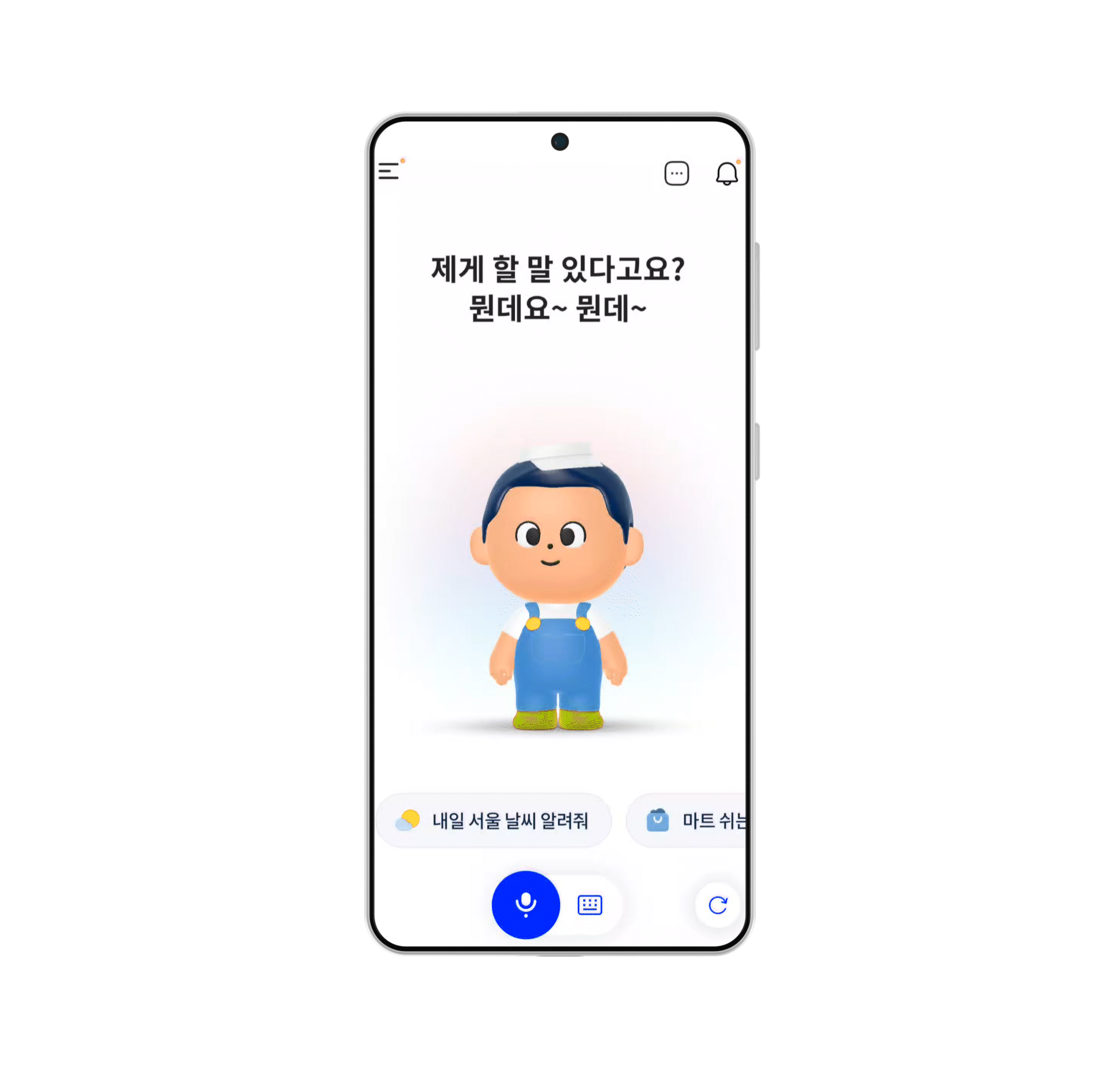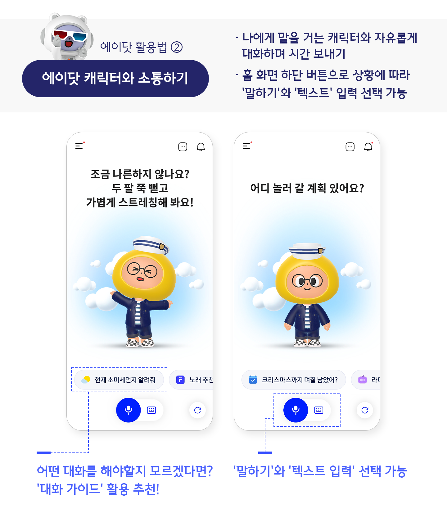 A.(에이닷) 캐릭터는 내가 말하지 않아도 먼저 말을 걸어주고, 문맥을 이해해 대답한다. GPT-3(거대 언어 모델) 기반의 한국어 특화 버전 AI 언어 모델이 탑재되어 있어, 자유 주제로 대화가 가능하다. 어떤 대화로 시작할지 모르겠다면 ‘대화 가이드’를 활용해도 좋다. ‘말하기’와 ‘텍스트 입력’ 두 가지로 대화 방식을 제공해 상황에 따라 편하게 부르면 된다. 끝말잇기 게임도 할 수 있다.