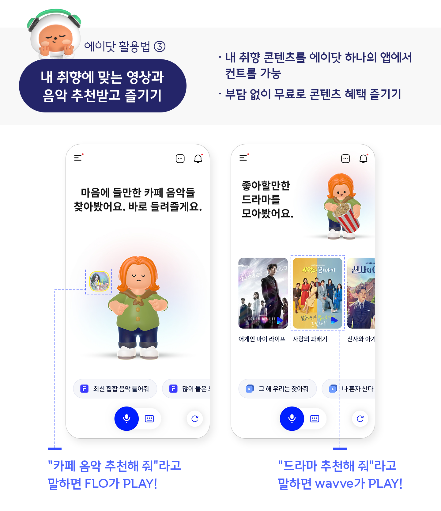 음악, 영화 감상이 취미라면? A.(에이닷)이 필수다. A.(에이닷)에서는 음악, 동영상을 부담 없이, 헤맬 필요 없이 즐길 수 있다. 런칭 프로모션으로 콘텐츠 이용료 없이 FLO를 통해 매월 90곡의 음악을 무료로 이용할 수 있다. 특히, SKT 고객은 데이터 통화료**도 무료다.